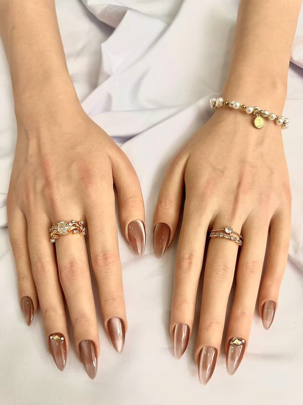 柔玫幻光微光粉玫瑰色如絲緞般流轉,貓眼光澤在指尖閃耀低調奢華。金屬鑽飾點綴其中,簡約卻充滿女人味,散發柔和而自信的高級氣息。