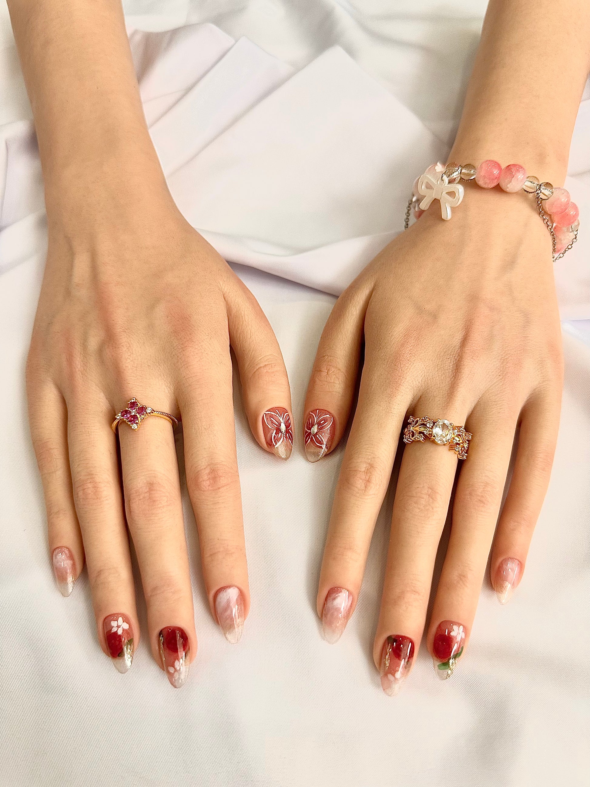 玫染初紅柔和的裸粉底色中渲染出手繪玫瑰與蝴蝶結,搭配金粉光澤與細緻暈染,像晨曦中綻放的玫瑰第一抹紅韻,婉約卻不失華麗。每一次抬手,都是一場溫柔的儀式感。🌹💫🍑
