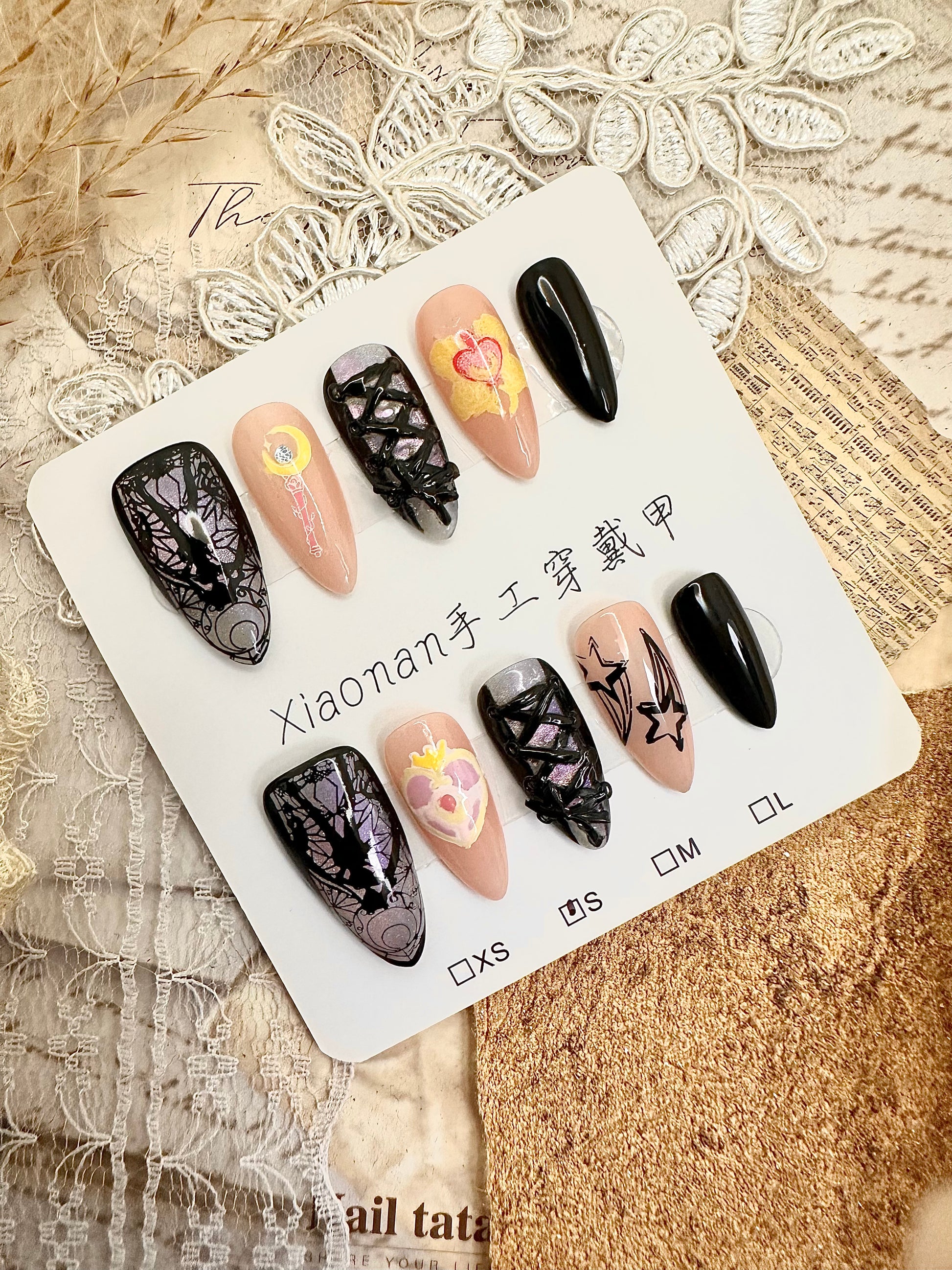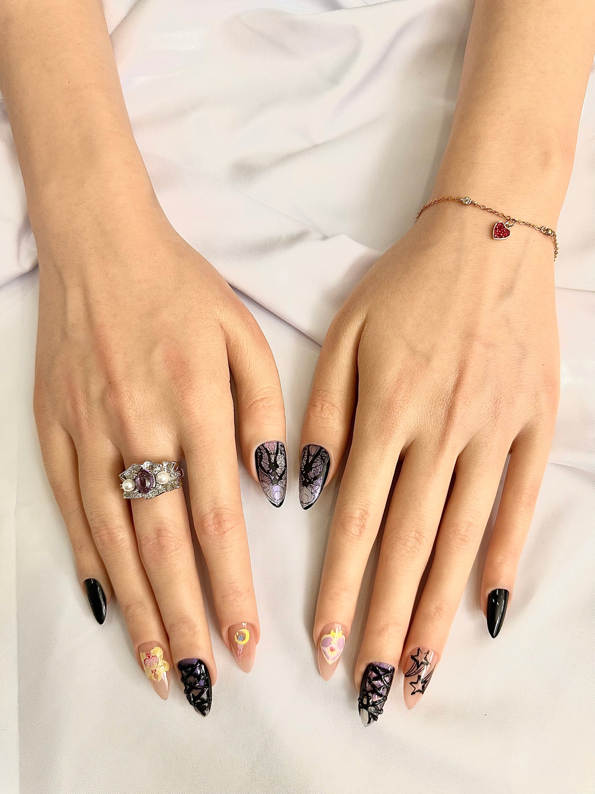 月光仙子裸粉與黑色交織,點綴蕾絲綁帶、月亮與心燈元素,宛如在夜空下舞動的仙子。浪漫與神秘同時綻放,讓指尖閃耀夢幻光輝。