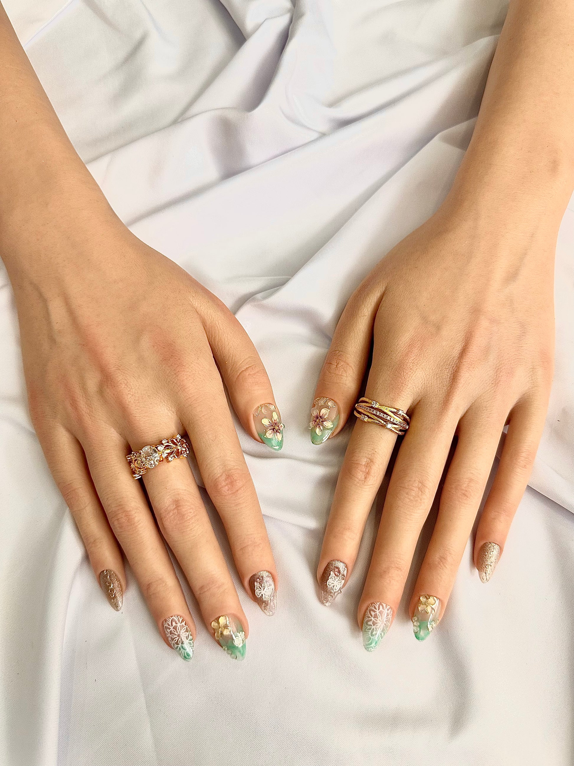 春野蝶語奶茶金與薄荷綠暈染交織,搭配立體小花與雕刻蝴蝶,彷彿走進春日山野,耳邊傳來蝴蝶低語。溫柔中帶點靈動,讓每個手勢都充滿自然氣息。🦋🌿🌼