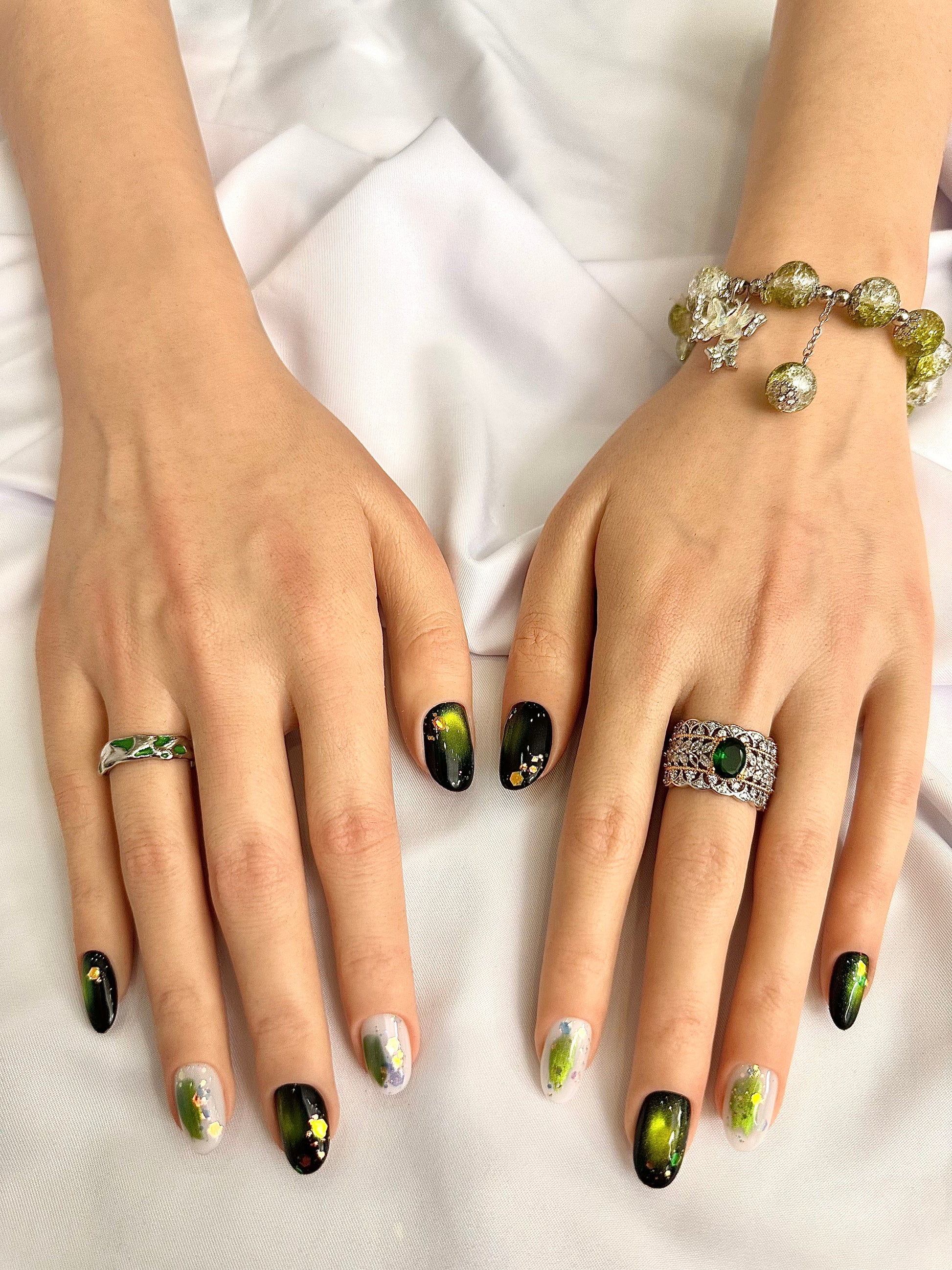 🕯️ 黑綠貓眼光澤🌿 手繪筆觸暈染✨ 彩屑點金設計