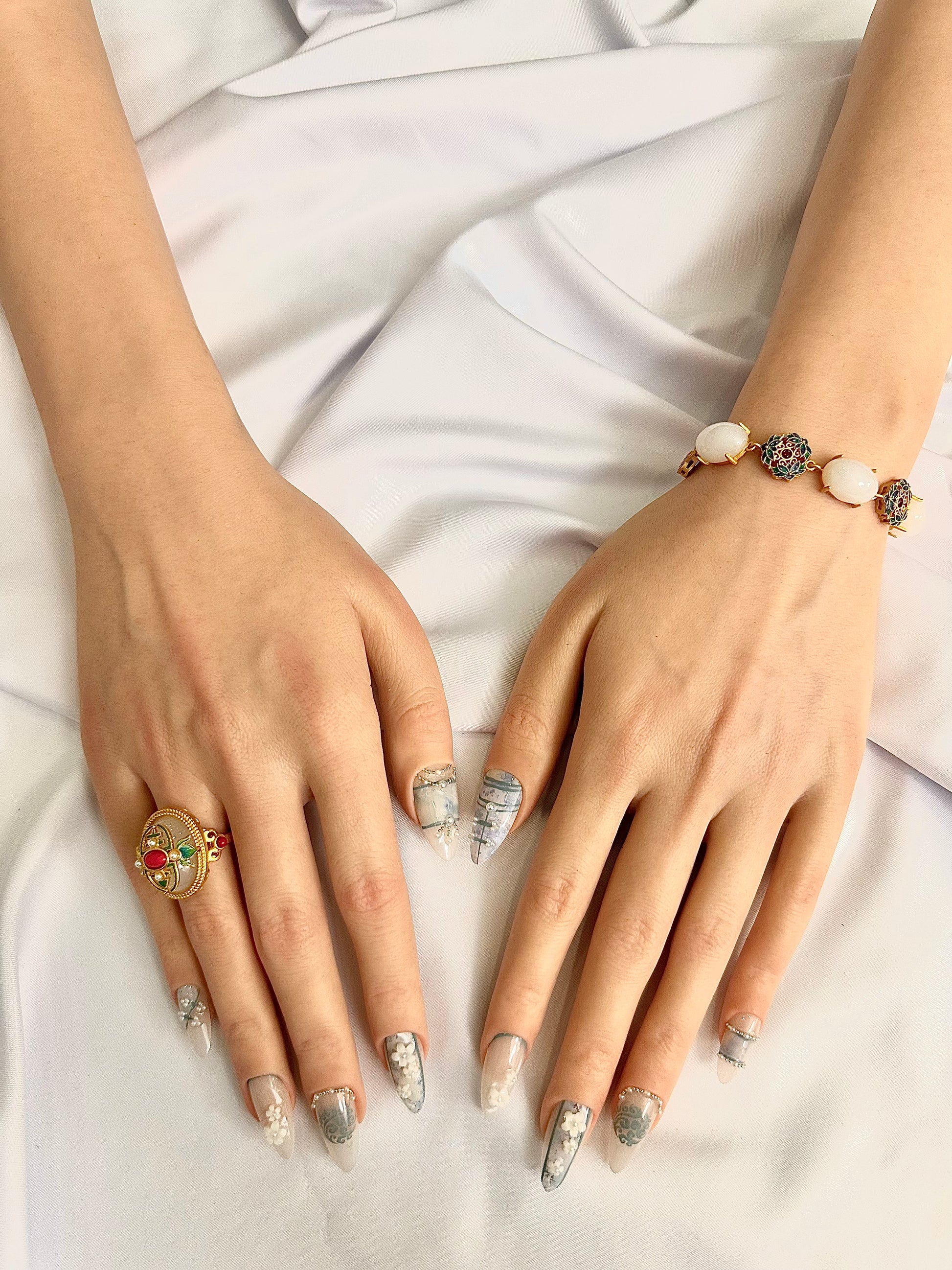 翠影瓷花以中國青綠色為主調,融合青花瓷的古典紋飾與淡雅釉色,點綴立體白瓷花與細緻珍珠,如古代瓷器上的綻放意象,清麗脫俗。柔和筆觸下蘊藏著東方風情的靜謐與優雅,宛如指尖流轉的藝術品。💠🌿🕊️